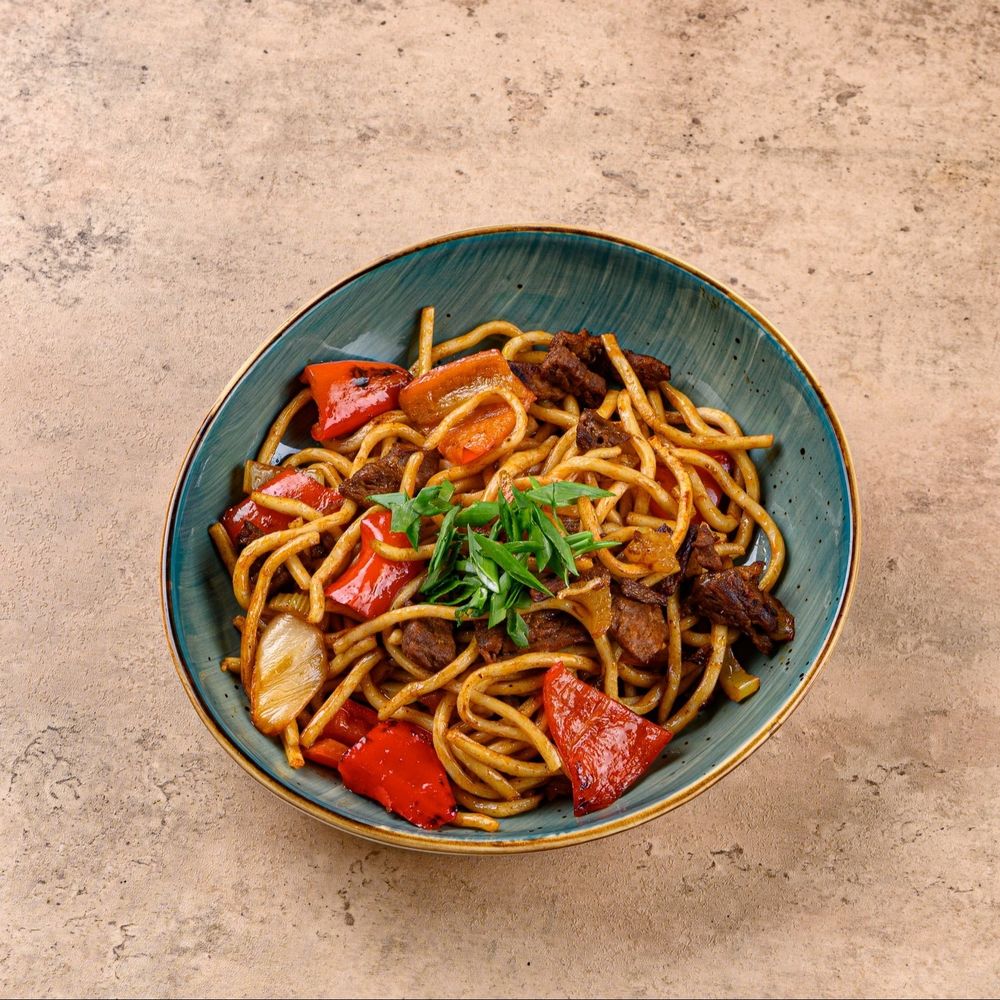 Сытный и ароматный лагман с обжаренной лапшой, сочным мясом и овощами. Все ингредиенты прожариваются до насыщенного вкуса, объединяясь в густой, ароматный соус с восточными специями. Состав:Лапша, говядина, болгарский перец, томаты, морковь, репчатый лук, чеснок, растительное масло, специи, зелень