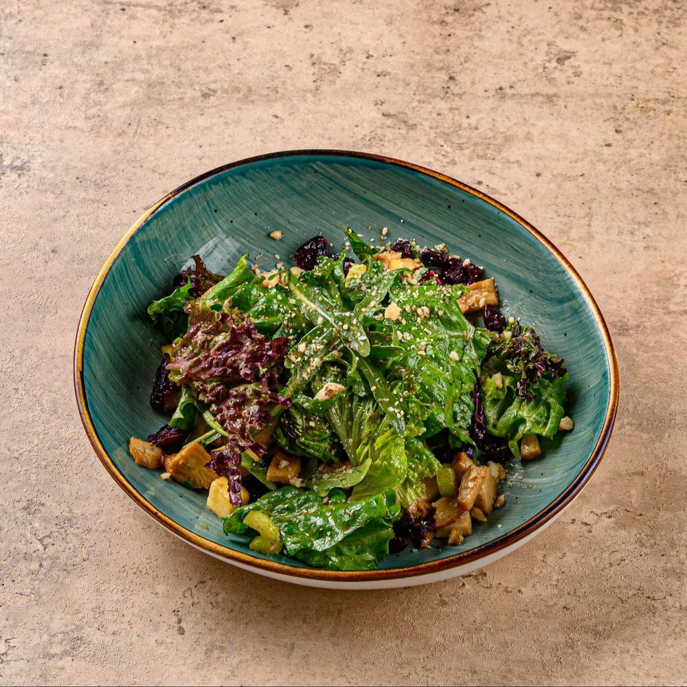 Освежающий и пикантный салат с яркой кисло-сладкой ноткой. Ароматный маринованный имбирь сочетается с кусочками сочного запечённого куриного филе, хрустящим сельдереем и нежными очищенными яблоками. Вяленая клюква добавляет лёгкую сладость, а микс салатных листьев делает вкус свежим и сбалансированным. Идеально подчёркивает горячие блюда и отлично подходит как самостоятельная лёгкая закуска. Состав: маринованный имбирь, куриное филе, вяленая клюква, сельдерей, яблоко, микс салата, специи.