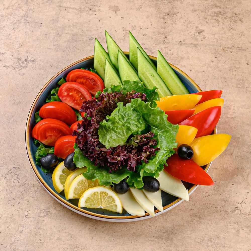 Свежая и лёгкая закуска из отборных овощей с добавлением брынзы и листьев салата. Идеально подходит как дополнение к основным блюдам. Состав: Свежие овощи, брынза, листья салата