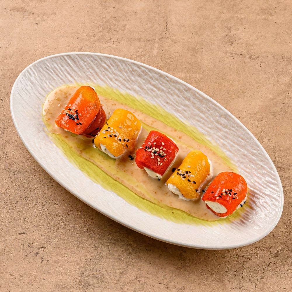 Нежные рулетики из запечённого перца с крем-чизом, в густом ореховом соусе. Состав: перец, крем-чиз, ореховый соус, кунжут