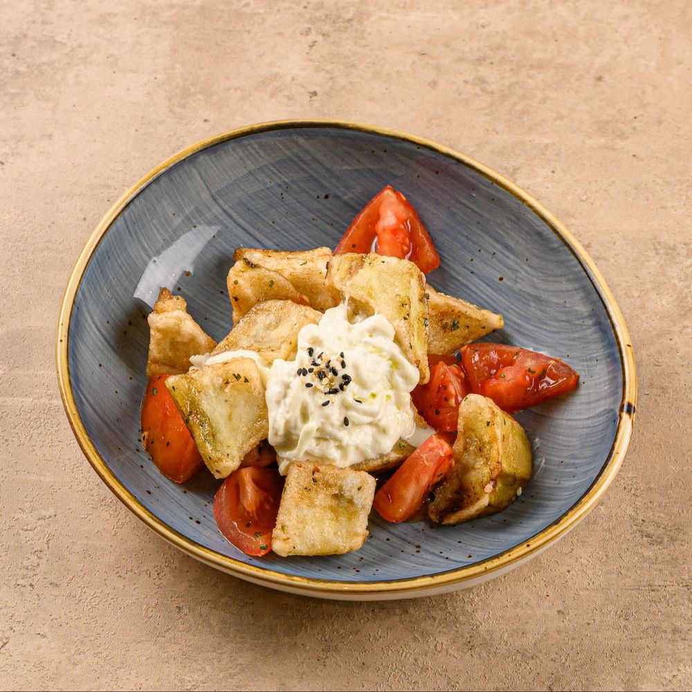 Хрустящие баклажаны в соусе с томатами и нежной страчателлой сверху. Состав: баклажан, страчателла, томаты, соус, кунжут