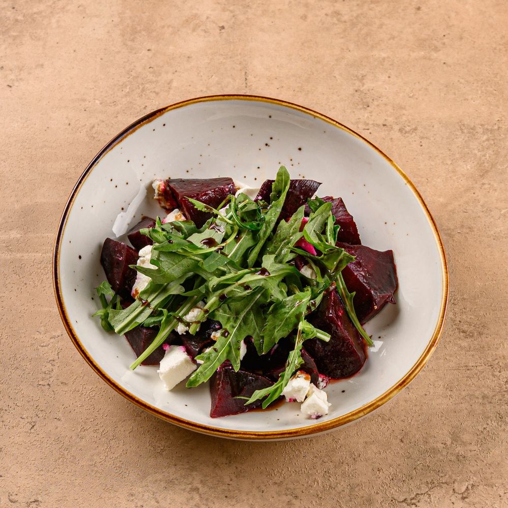 Запечённая свёкла с ярким вкусом, свежей рукколой и нежной фетой, с лёгкой кисло-сладкой заправкой. Состав: свёкла, фета, руккола, оливковое масло, лимон, бальзамик