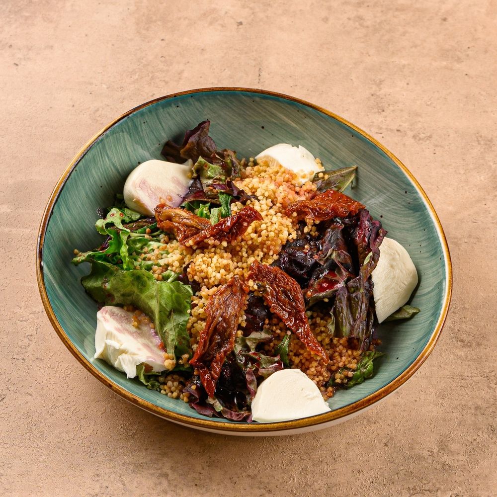 Сытный и насыщенный салат с нежным тары, сладкими вялеными томатами и сливочной моцареллой. Свежая зелень и лёгкая бальзамическая заправка делают вкус ярким и сбалансированным. Состав: тары, моцарелла, вяленые томаты, черри, красный лук, салат, бальзамическая заправка