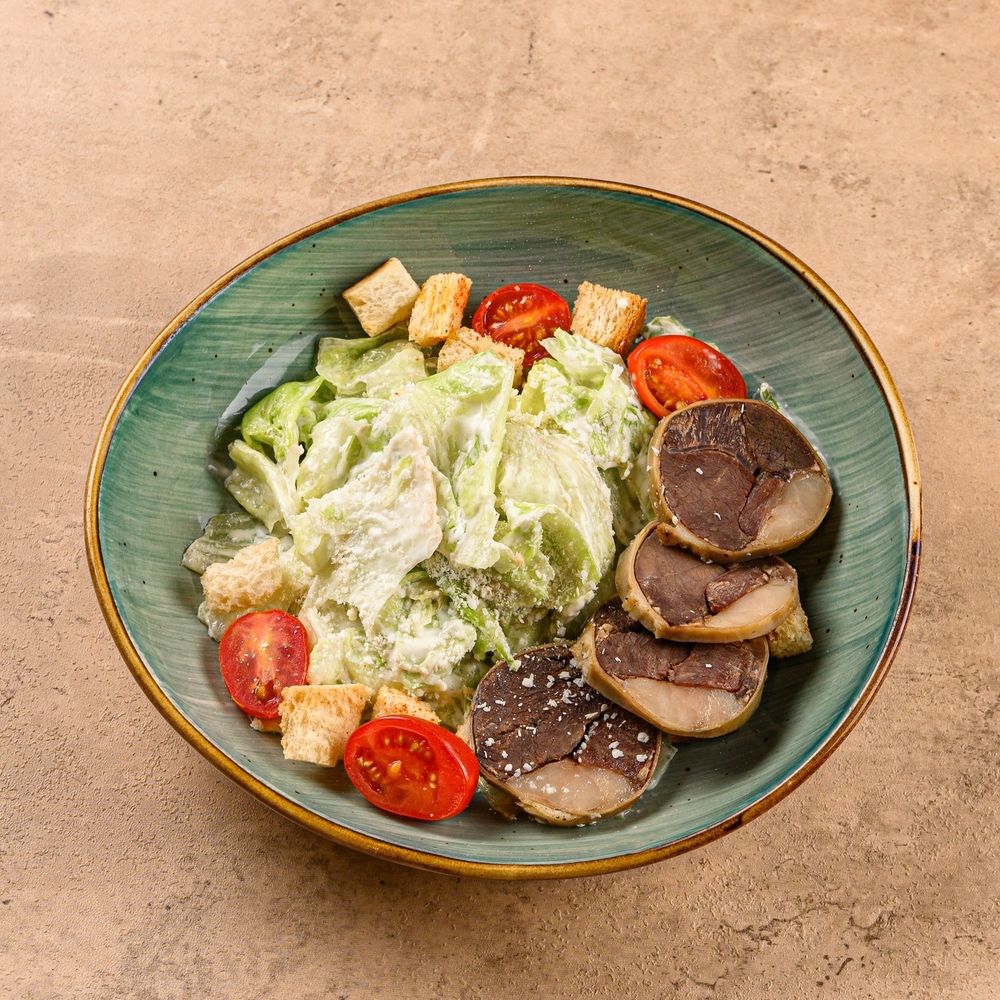 Хрустящий салат с насыщенным соусом и нежными слайсами казы, с сочными томатами и лёгкой солоноватой ноткой курта. Состав: айсберг, казы, соус цезарь, черри, яйцо перепелиное, сухари, курт