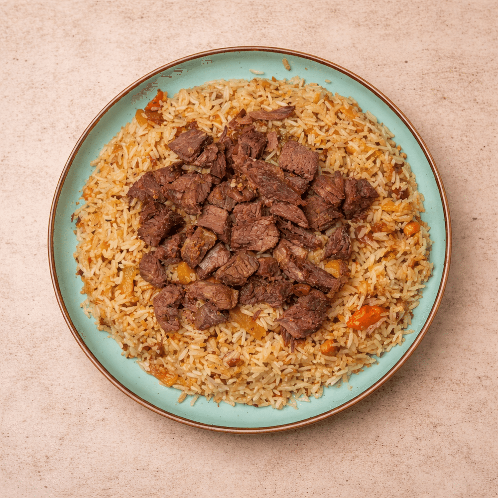 Праздничный плов с мягкой говядиной и сладкой морковью, томлённый до глубокого вкуса. Состав: Рис, говядина, морковь, лук, чеснок, растительное масло, зира, специи, 1 кг.