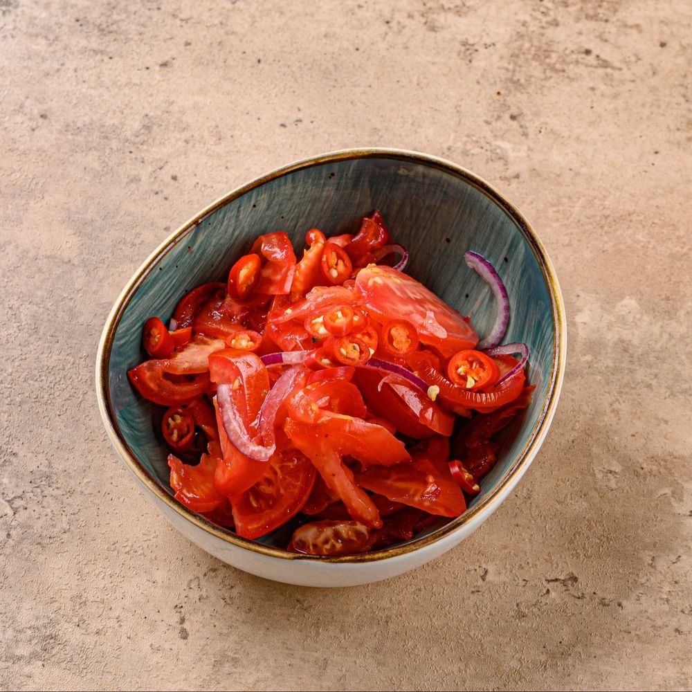 Классический восточный салат из сочных спелых томатов и тонко нарезанного лука, приправленный специями. Свежий, ароматный и идеально подходящий к плову и мясу. Состав: томаты, репчатый лук, специи.