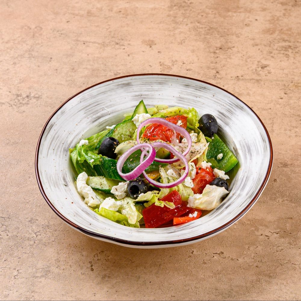 Классика, которая всегда актуальна. Сочные томаты, хрустящие огурцы, нежная фета и ароматное оливковое масло создают лёгкий, свежий и по-настоящему летний вкус. Отлично подходит как самостоятельное блюдо или дополнение к горячему. Состав: томаты, огурцы, фета, оливки, оливковое масло.