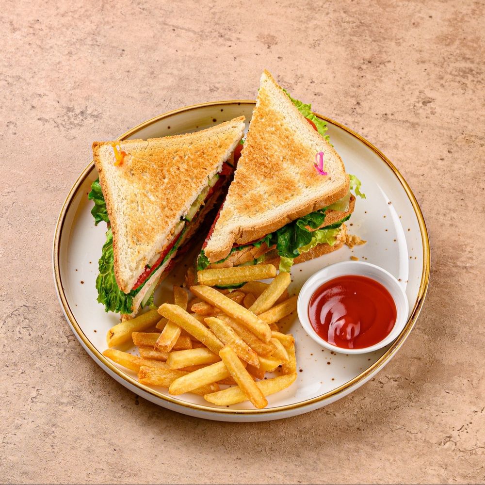 Сытный сэндвич с сочной курицей, свежими овощами и нежным соусом. Лёгкий, но насыщенный вкус — удобно взять с собой или перекусить в течение дня. Состав: хлеб, курица, салат, томат, сыр, соус